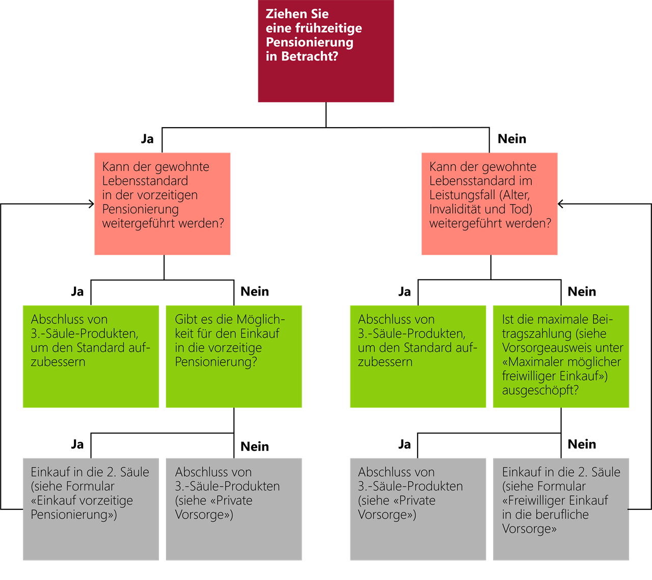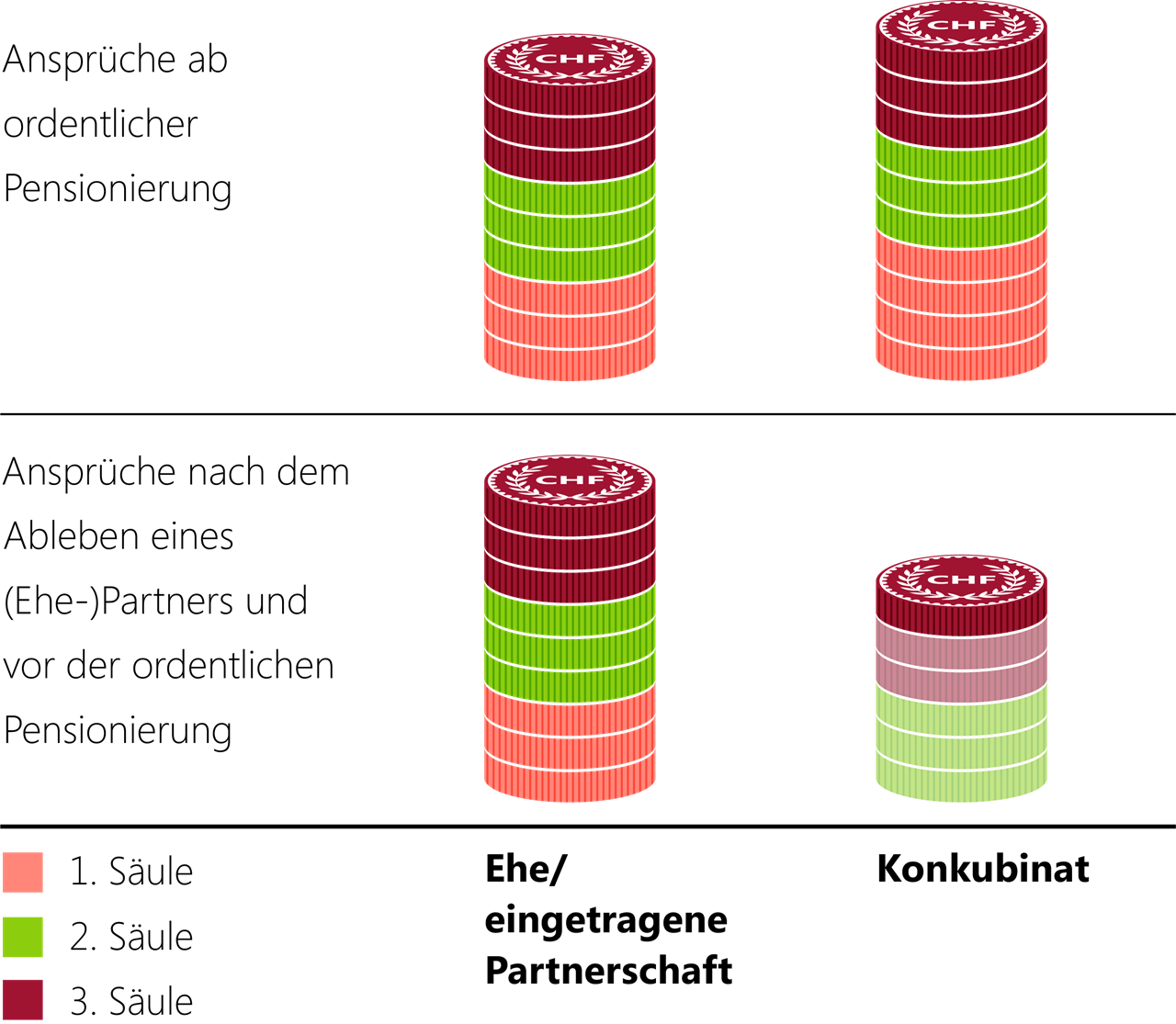 In diesem Ratgeber erfahren Sie, welche Leistungen Sie von den unterschiedlichen Säulen nach der ordentlichen Pensionierung oder nach dem Ableben eines Ehegatten bzw. Partners erhalten. Beachten Sie, dass Ehe und eingetragene Partnerschaft für die folgenden Ausführungen gleichgestellt sind.