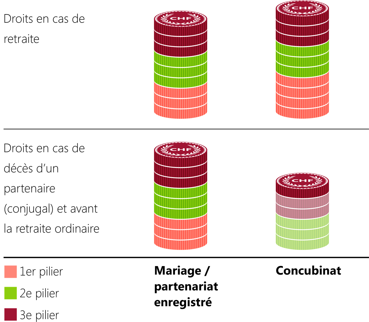 Droits en cas de retraite | Le montant maximum des deux rentes d’un couple est de 150% de la rente individuelle maximum, à condition que les deux conjoints soient soumis à l’AVS et ne présentent pas de lacunes de cotisations. | S’il n’y a pas de lacunes de cotisation, les partenaires reçoivent chacun une rente individuelle à 100%. Conjointement, cela représente 50% de plus que pour les couples mariés. |